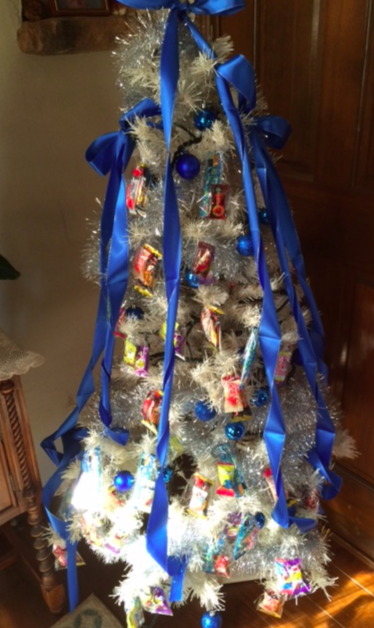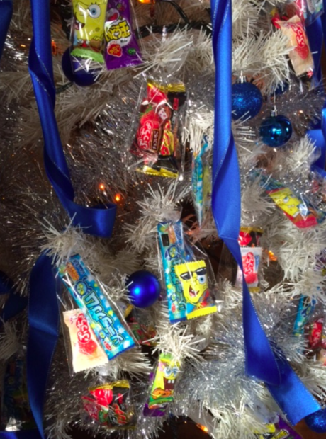 おかしツリー完成 といってもお菓子を葉っぱにゆわえただけけど。