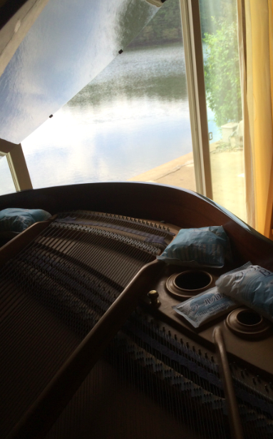 ピアノは海に面した窓の手前においてるんで、蓋の裏に海やらカモさんが写りこんで、なかなか癒されますよ。