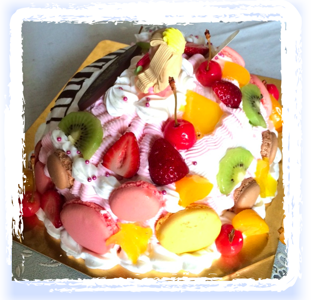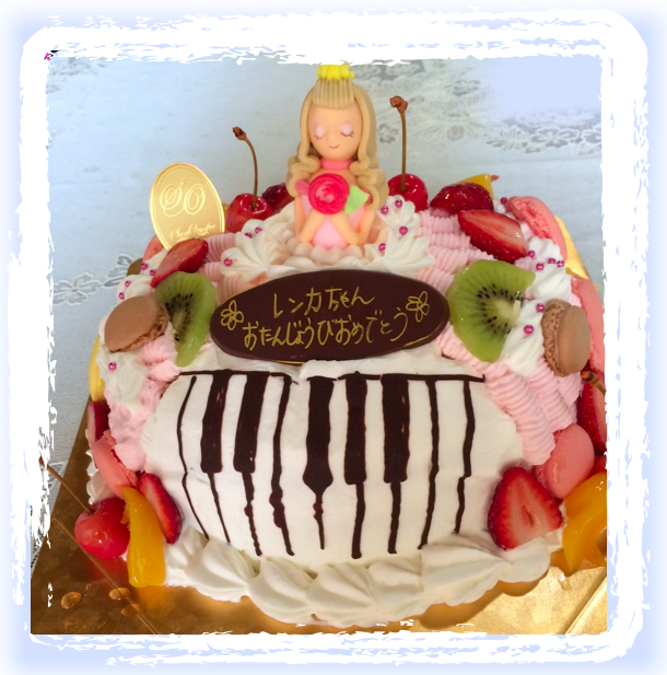 ベースはドールケーキですが、飾り付けはイチゴ以外に、カラフルに派手目、オノフレ名物のマカロンも沢山貼付けて、ドレスの裾にはピアノの鍵盤を書いて、、、と、注文しまくりましたが、いかがですか?可愛いでしょう。味はオノフレさんのケーキなので、間違いなく美味しかったです。これで5000円でしたが、写真で見るより実物はもっと大きく、8人前くらいはあるかな?高いのか安いのかは気持ち次第かな。でも、オーダーとる方が、丁寧にリクエスト聞いて下さって、パティシエさんに確認したり、スムーズに注文出来て、ほぼイメージ通りになってよかったです。