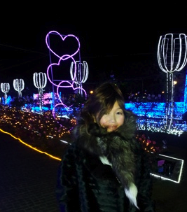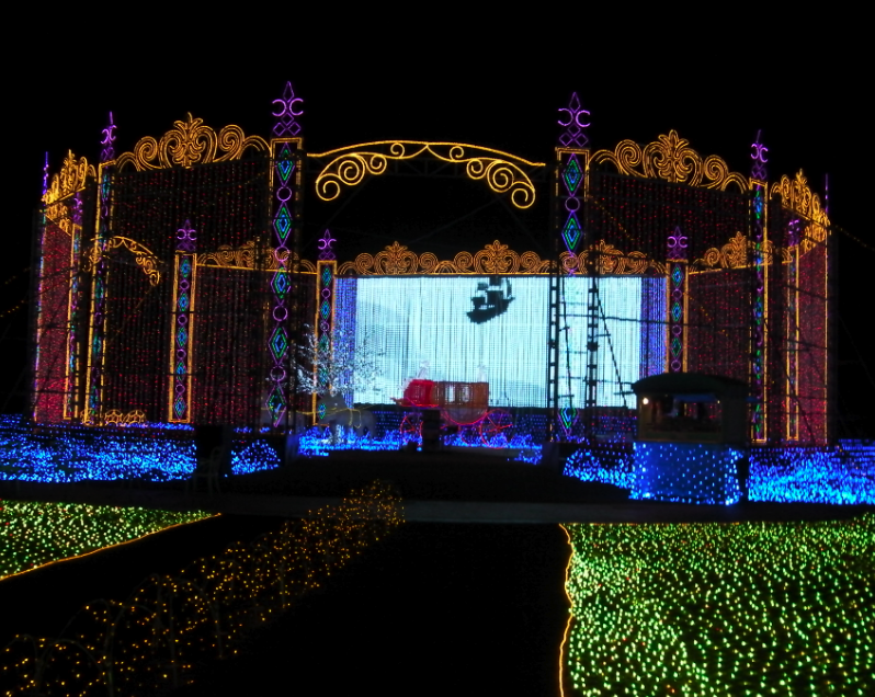 お花畑(地面)に敷き詰められたイルミネーションがウェーブのように輝くのがきれいでした。写真の下に緑の草のようなのは、全部電球。中央の馬車の中で写真も撮れます。