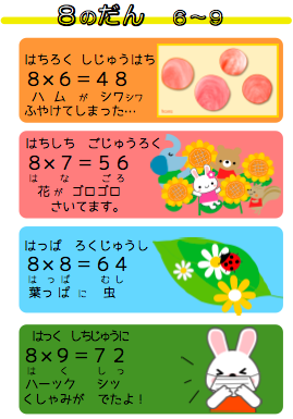 後半の、かける数字が大きくなる段をなかなか覚えられなかったので、7と8の段の語呂合わせを作ってみました。これで何とか覚えられました。
