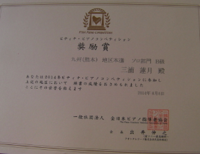 予選が終わった後、じんましん作って、本選死んでも出ないとだだこねてたのを(練習がきついから)、私とルーミン先生で説得し、曲をクレメンティのソナチネからハイドンのメヌエットに変更して、約3週間で何とか仕上げる暴挙に出ましたが、今回は恥かいても予選通過したからには本選に出るという気持ちで臨んで、高望みはしてなかったので、奨励賞でも嬉しかったです。