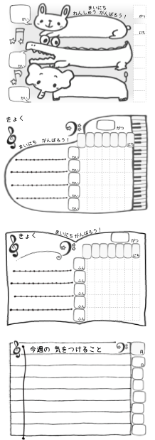練習表は色々作りましたが、3歳児から、大人まで、何タイプも必要だなと思いました。大きい子は大きめの表が書き易いけど、ちびっ子は楽譜ごとに分けた方がしてきてくれるかな。