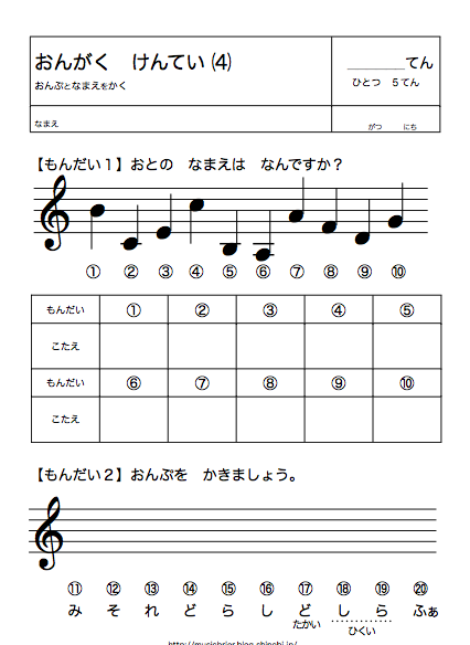 検定をするまえに、「おんがくけんていのまえに」という項目で予習をしたり、ここのサイトにのってる「音符の表」で、長さ覚えたりしてから受けてみて下さい。