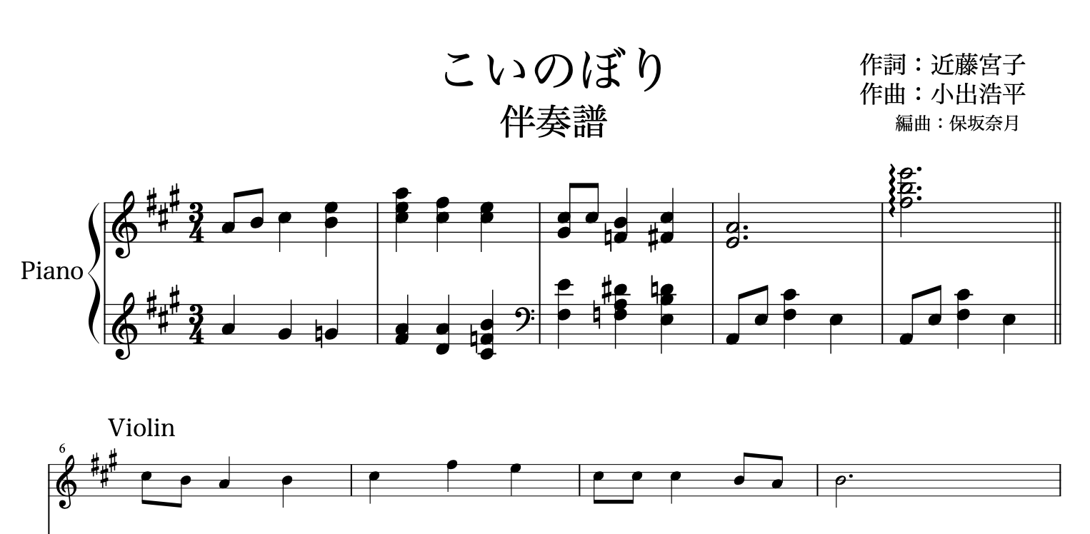バイオリン用の楽譜は、楽譜の目次から探して下さい。イ長調で簡単に弾けます。