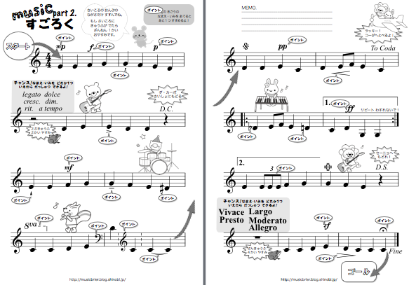 大きい、小さいを表すのに恐竜や赤ちゃんの絵をつかったり、全音符は4つ延ばしだから四葉の絵とか、楽しく覚えられるようにしてみました。